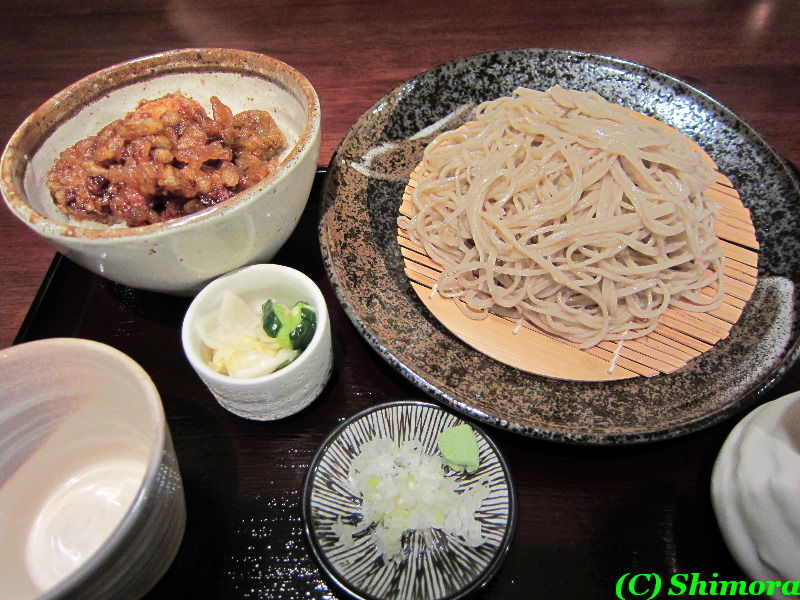 さて、オーダーはと言いますと、私が平日のランチメニューから野菜天丼とそばのセットを大盛で、家内はきのこ汁のつけ麺。