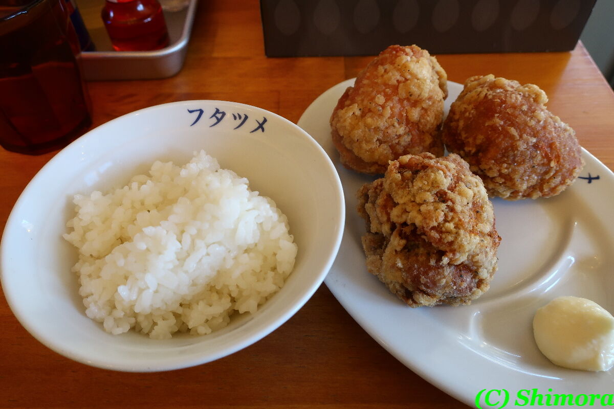 まずは唐揚げセットから出まして、相変わらず拳くらいの大ぶりの唐揚げが3コと半ライス。