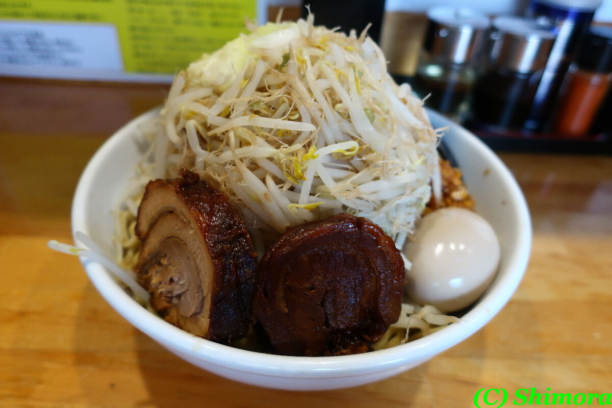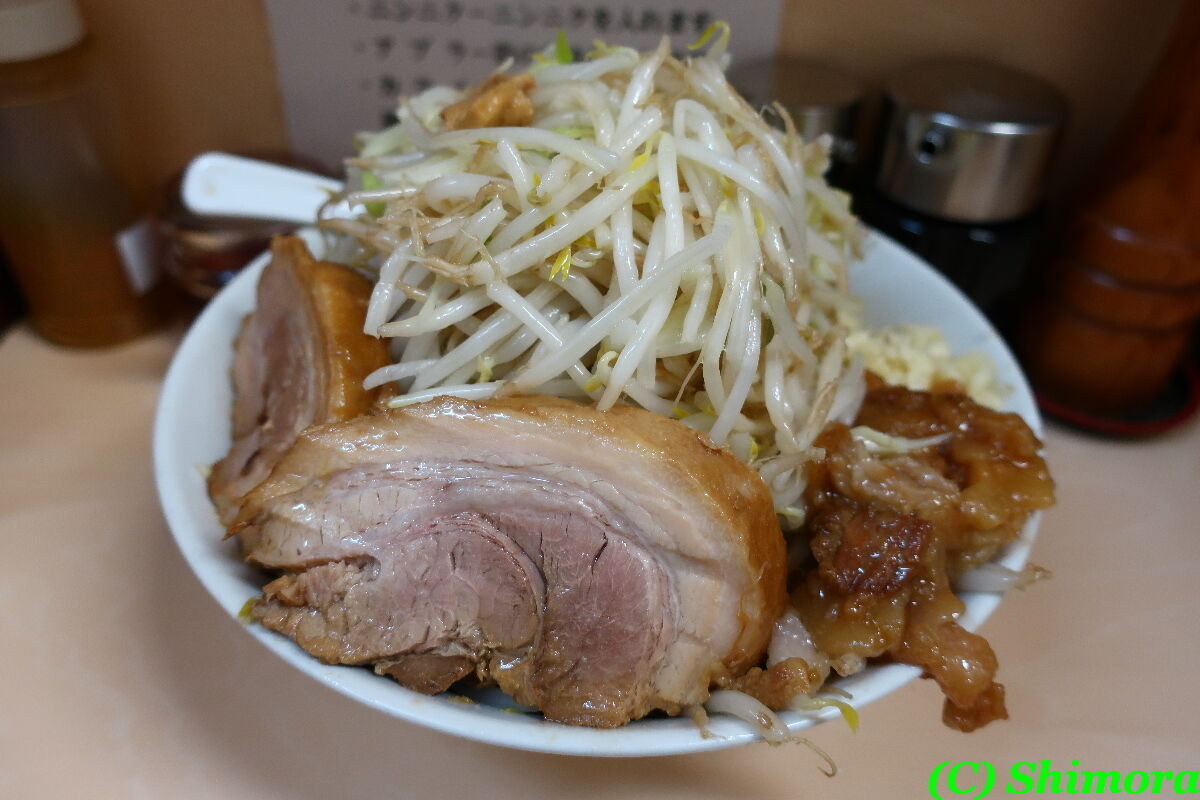 こんもりしたモヤシの山に、厚めの豚さん2つ、それと味付け脂少々とニンニク。