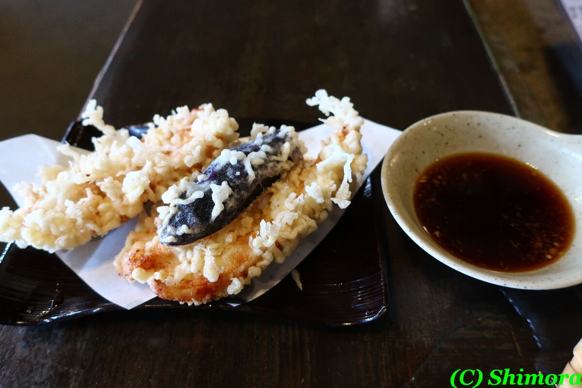 とり天ですが、大きめの胸肉の天ぷらが2枚と茄子天1つ。