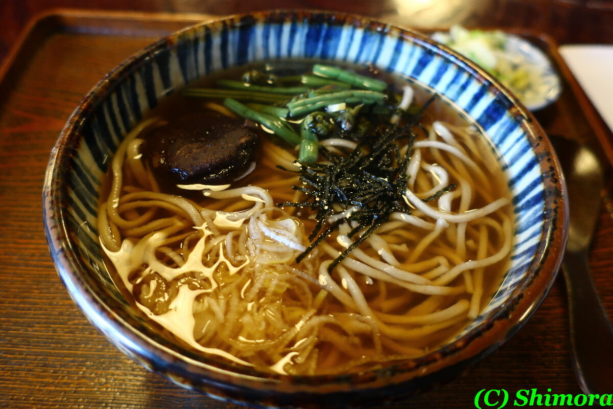 さてかけそばですが、椎茸に山菜類が乗っていまして見た目は山菜そば。